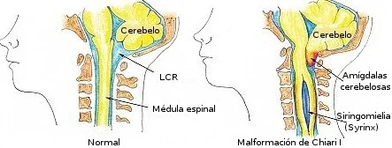 La malformación de Chiari (MC) es una enfermedad congénita ligada al cromosoma X. Se produce cuando el cerebelo, órgano encargado de controlar el equilibrio y la coordinación neuromuscular, desciende a través del foramen magnum (orificio mayor del cráneo) y comprime el tronco encefálico provocando una herniación cerebral.